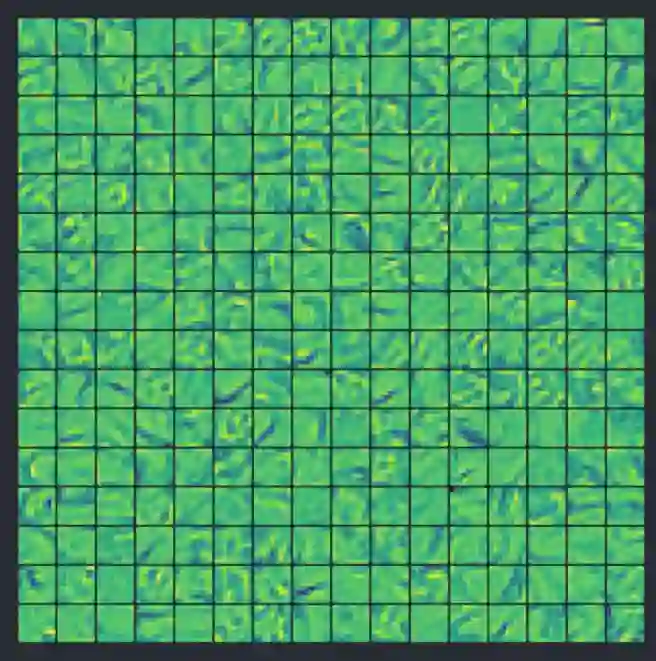 如下所示是经过训练后最终得到的 256 个卷积核(为了方便理解我给他们上了色)。我们用蓝色来表示负数, 用 0 来表示绿色,用黄色来表示正数. 并且颜色越强,其绝对值越大。