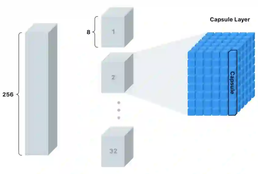 但这一次我们想要的不仅仅是一些糟糕而普通的旧数据。我们要把这个栈切分成 32 层,其中每层有 8 个块,我们称之为「胶囊层」,每个胶囊层有 36 个「胶囊」。