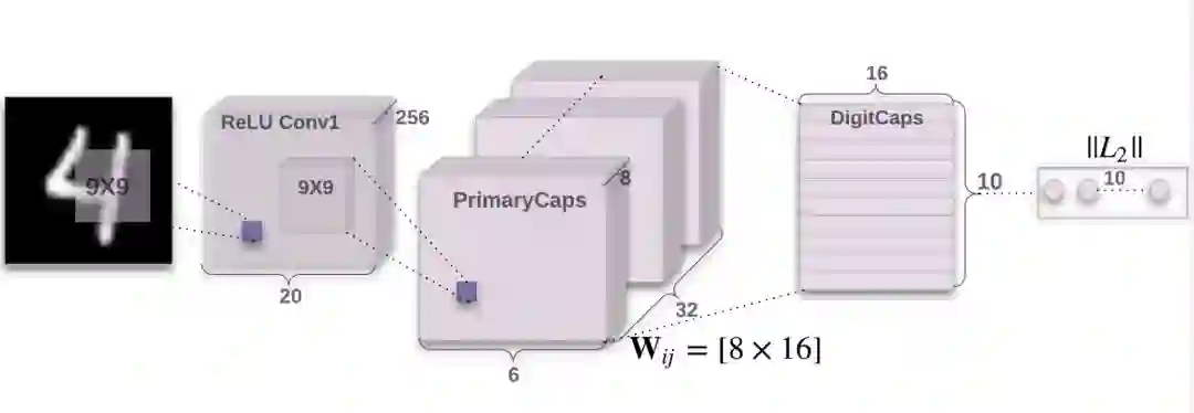 但需要注意的是,我们如果我们想要选择更深层的胶囊网络,我们就要扩大胶囊的维度。从直觉上来说,这是可行的。因为我们使用的网络越深,特征表达就越复杂,需要我们再现的参数就更多。举例来说,描述一整张脸比描述一只眼睛需要更多的信息。