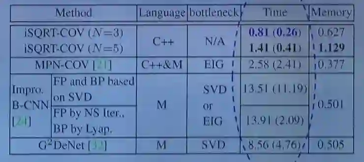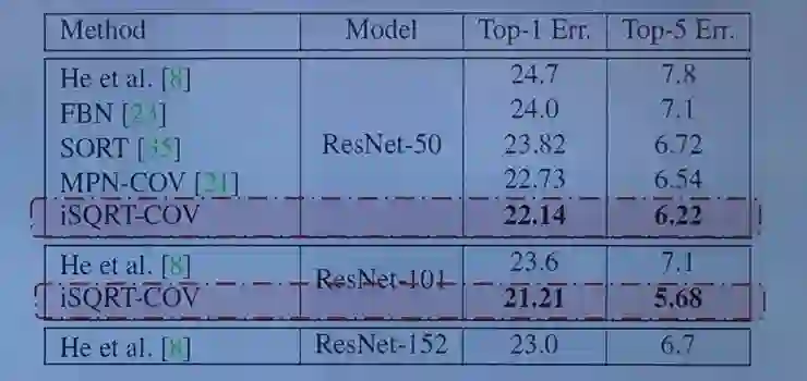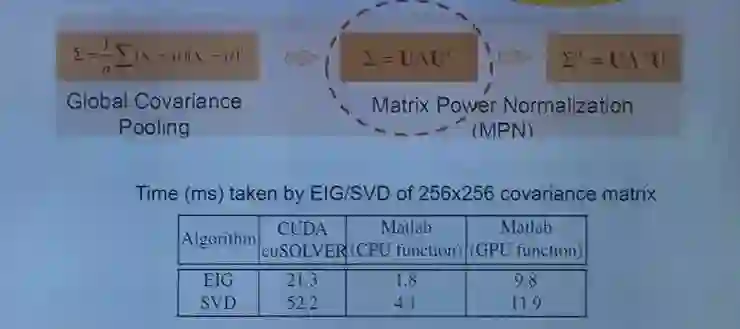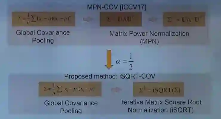 使用二阶协方差的平方根作为全局池化,其优点在于能够利用深度网络学习后的各通道之间的相关信息。而以前的全局平均池化则只是算出了每个通道的均值,而忽略了通道之间的相关信息。在发表在 ICCV 2017 的这篇论文中,他们首次将全局协方差池化的方法应用于大规模视觉识别任务当中,在同样的 50 层圣经网络模型下,使用全局协方差池化,识别率可以提高 2 个百分点。需要注意的是,在这篇文章中,他们求解协方差平方根的方法是将协方差进行本征分解得到本征值,然后求本征值的平方根。