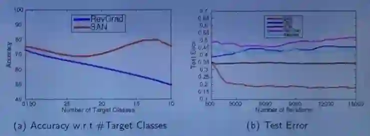 在这一个分析图中,可以看出在 source domain 一定的情况下,target domain 中的类数量越少,选择对抗网络的表现越好,而作为对比基于对抗网络的深度迁移模型 RevGrad 则会随着 target domain 的类数量减少性能逐渐下降。而另一方面,SAN 的误差相比其他模型也要低得多,且在迭代中更快地达到稳定。