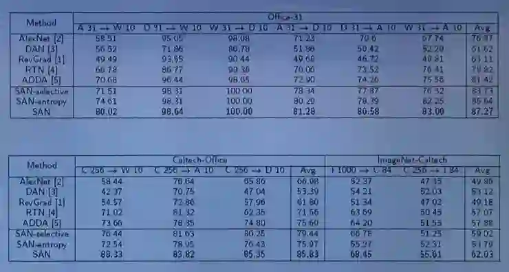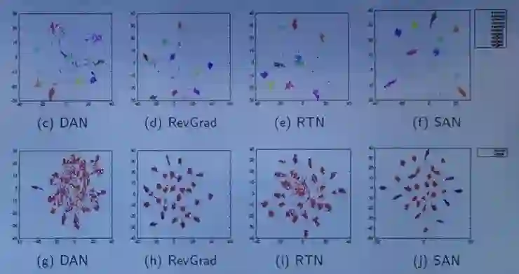 他们也将结果进行了可视化。可以看出 SAN 能够将不同的类清晰地区分开来,source domain 和 target domain 中相似的类别能够有效地聚在一起;作为对比,其他方法中两个 domain 中的类则全部/部分地混杂在一起。