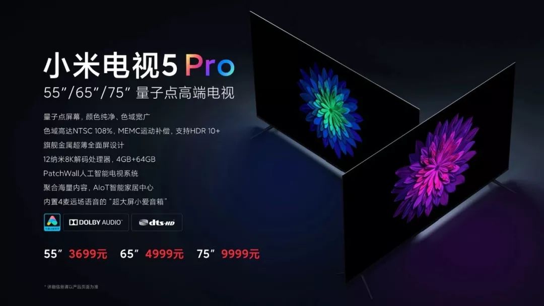 小米电视 5 Pro,55 吋 3699 元、65 吋 4999 元、75 吋 9999 元