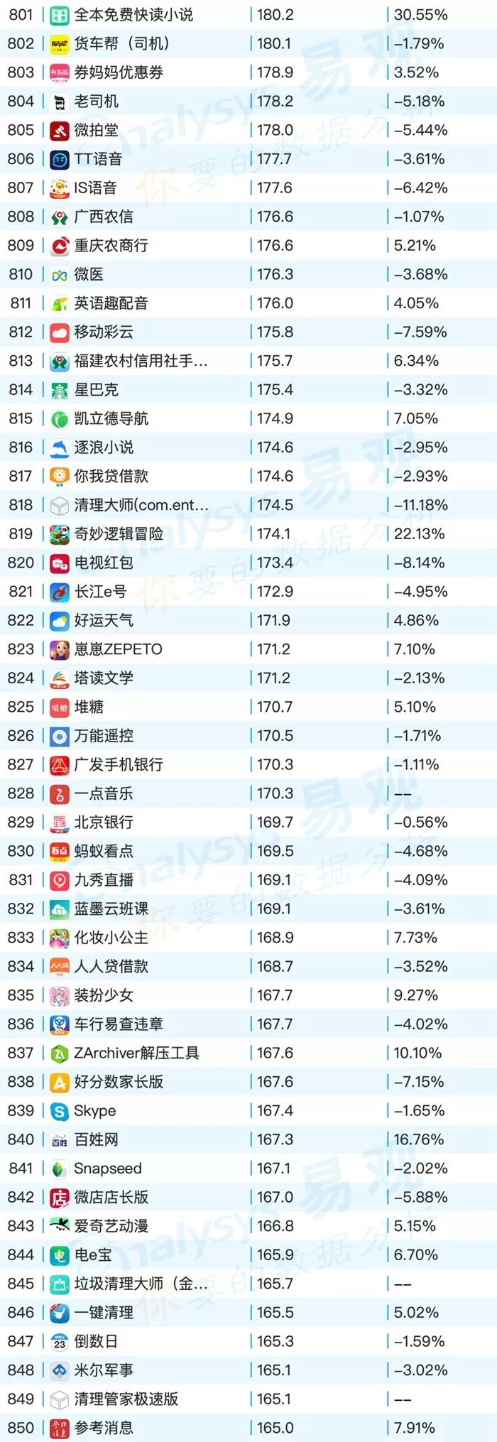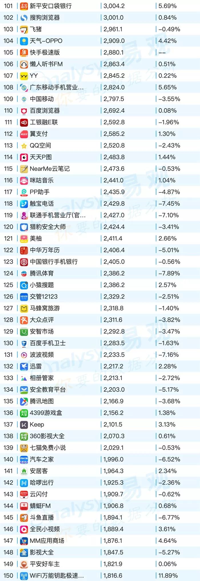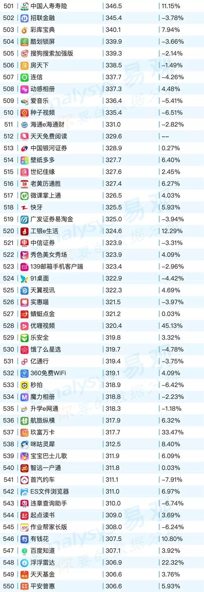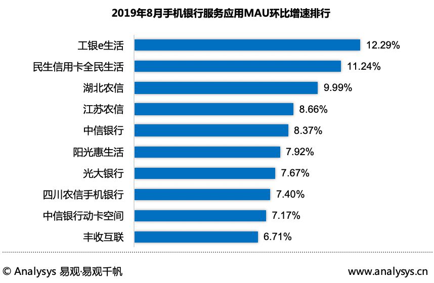 2019年8月,在ETC、营销活动、场景拓展等因素影响下,银行服务领域活跃用户整体环比上涨。其中工银e生活活跃用户环比增长12.29%,其上线了ETC功能,支持ETC申请、绑卡、查询;同时推出丰富的营销活动,如新下载注册用户可享188元礼包,以及1折购买电影票等,共同促进工银e生活活跃用户增长。光大银行手机银行着力拓展生活场景,推出“阳光好医生”,提供综合性移动医疗服务,同时新增专车、外卖、电影票等生活服务,助力其活跃用户规模及粘性提升。