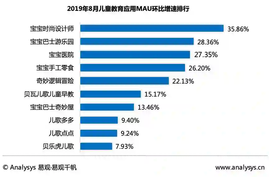 8月,宝宝巴士旗下的应用继续领跑儿童教育领域增幅榜,宝宝时尚设计师、宝宝巴士游乐园、宝宝医院等多款APP的增速均达到20%以上。另外,贝瓦儿歌儿童早教、儿歌多多、贝乐虎儿歌等儿歌类早教APP也有较好的增长表现。在多元兴趣培养的早教趋势下,提供一站式教育解决方案是儿童教育领域的整体发展方向。
