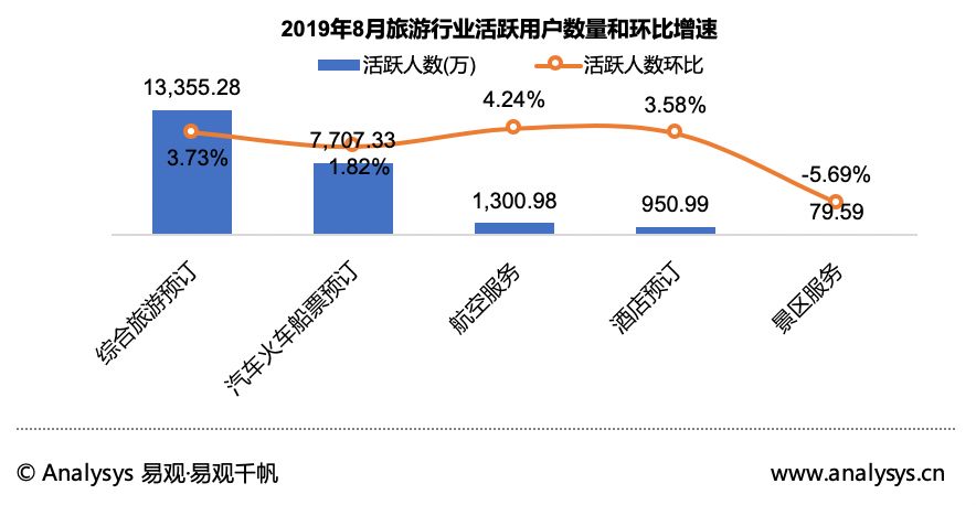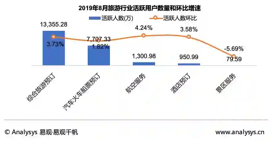 8月,暑期出游季接近尾声,在线旅游市场的整体活跃度较上月有所降低,度假、酒店、民宿等细分市场均显示出小幅回落态势。而在学生返校、中秋小长假预热的共同作用下,在线交通预订市场整体得到6%~7%的上涨,相关的汽车火车票、航空服务预订类应用的用户,均表现出了更高的活跃度。