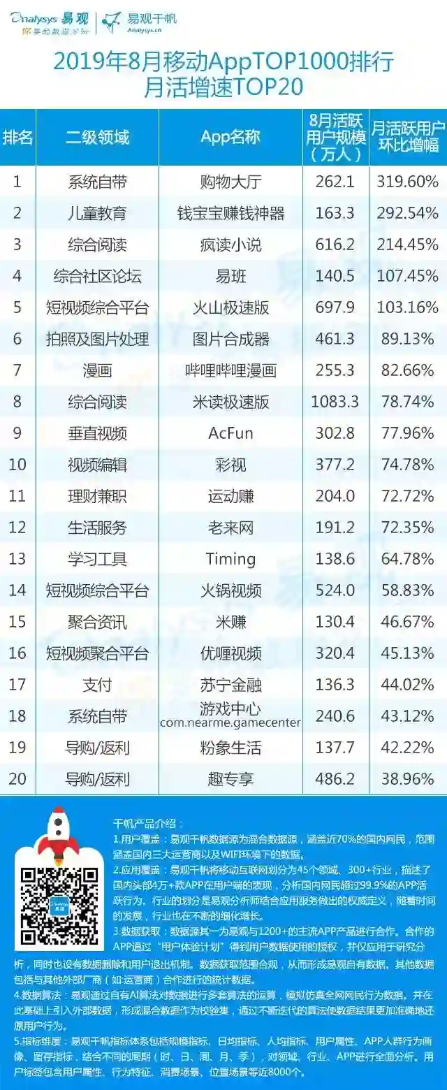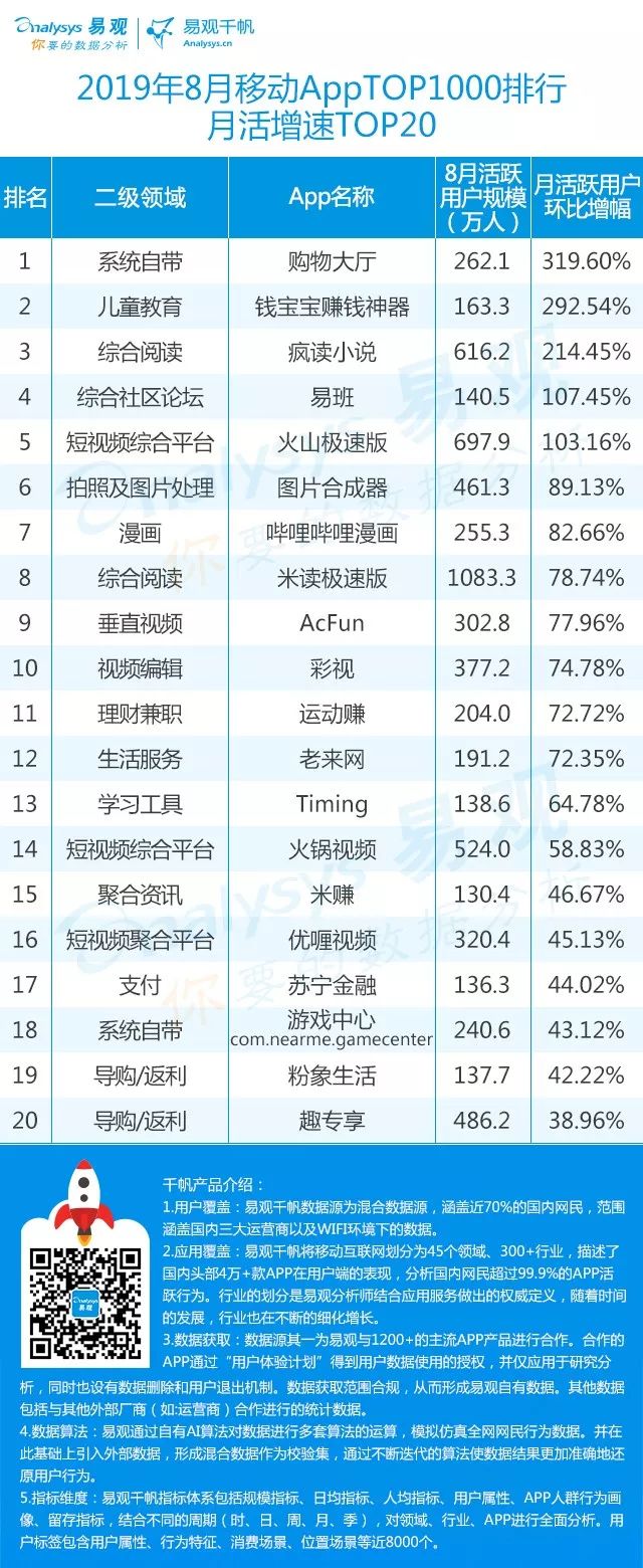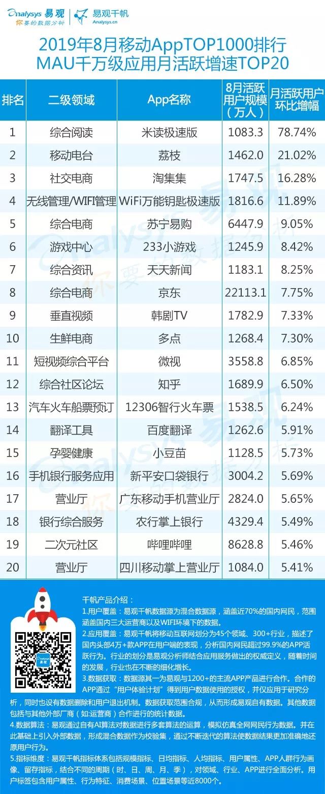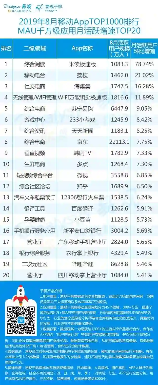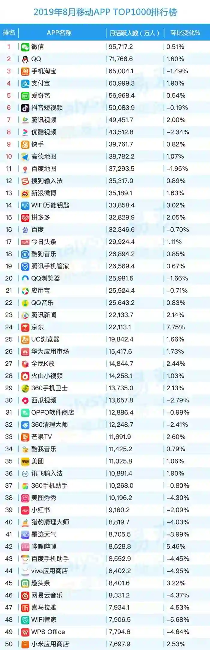 2019年8月,随着暑期步入尾声,开学季临近,移动互联网旅行交通、综合旅游等领域开始升温;旅游出行、网上购物领域则紧抓暑期黄金季尾巴,通过一系列活动和优惠维持热度,月活环比不降反升。在用户规模上,移动互联网用户环比增长0.07%,人均单日使用时长环比增长0.8%。
