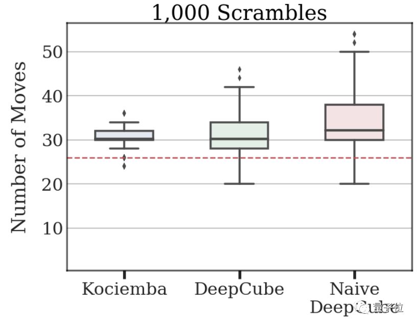 第一场,DeepCube和Kociemba的方法用640个随机打乱的魔方进行了比拼,这些魔方都被胡乱拧了1000次。
