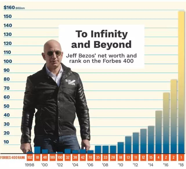 贝索斯在采访中称:“我们仍处于互联网的‘第一天’,因此亚马逊也才刚刚开始。”但事实上,亚马逊股价在过去的3年上涨了270%,市值也于近日突破了1万亿美元,成为继苹果公司之后第二家市值达到1万亿美元的科技公司。与此同时,贝索斯的个人净资产也增加到约1600亿美元,成为全球首富。