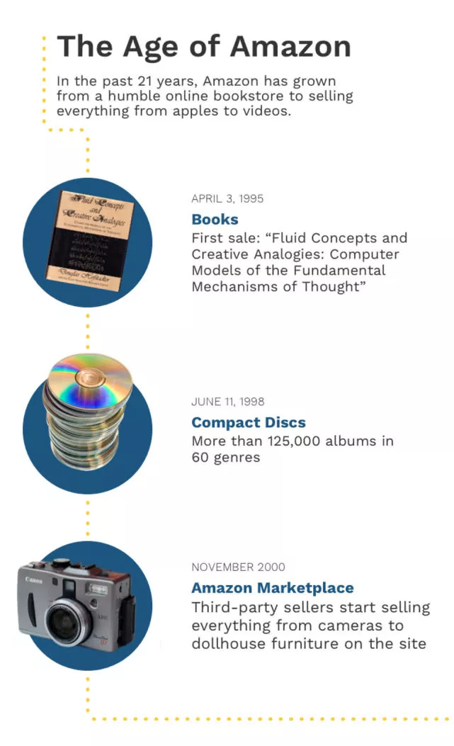 在过去的21年,亚马逊从一家小型在线书店发展成为销售几乎所有物品的大公司,包括水果和食品。