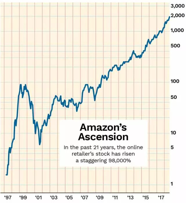 这番话真的让人忍俊不禁。如今,亚马逊的销售额、利润和股价都在快速增长。在过去的3年,亚马逊股价上涨了270% ,在过去的12个月上涨了103%。近日,亚马逊市值已突破1万亿美元,成为继苹果公司之后第二家市值达到1万亿美元的科技公司。与此同时,亚马逊CEO贝索斯的个人净资产也增加到约1600亿美元,成为全球首富。
