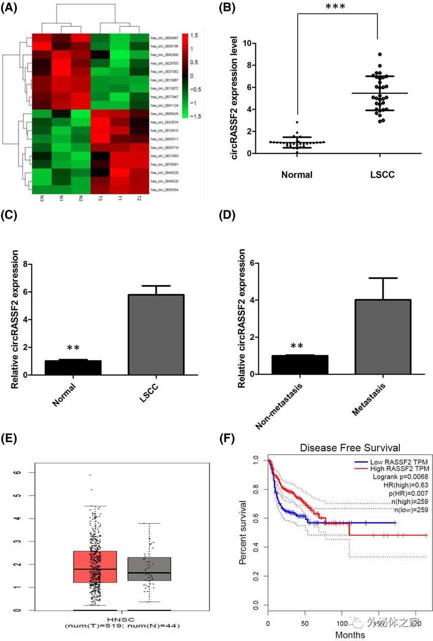 图:在LSCC组织中表达异常的circRNA,其中circRASSF2在LSCC中高表达并预测了不良的肿瘤行为
