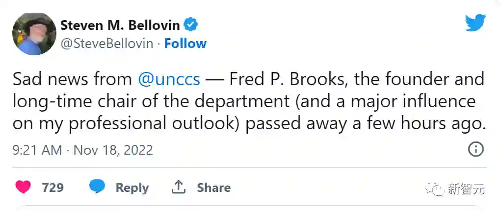 哥伦比亚大学计算机科学教授Steven Bellovin也发推对这位大牛的逝世表示悼念,并表示Brooks对自己的职业规划产生了重大影响。