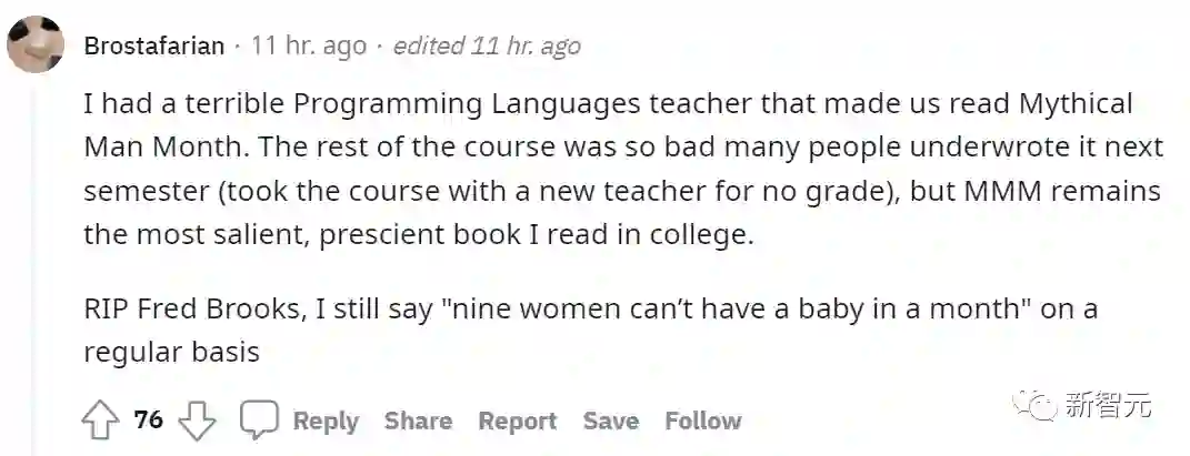 难怪在Reddit上,有人称《人月神话》是所有软件工程师的必读书目后,网友回复道:「看上去这本『必读书目』也是『必忘书目』。Brooks提到的经验教训,我们什么时候才能真正学到呢?」