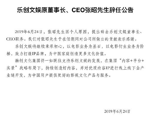 6月24日,张昭辞去乐创文娱的董事长、CEO的职务,悄然离开了这家他一手创立八年的公司。继任的是融创集团董事长孙宏斌的大儿子孙喆一。