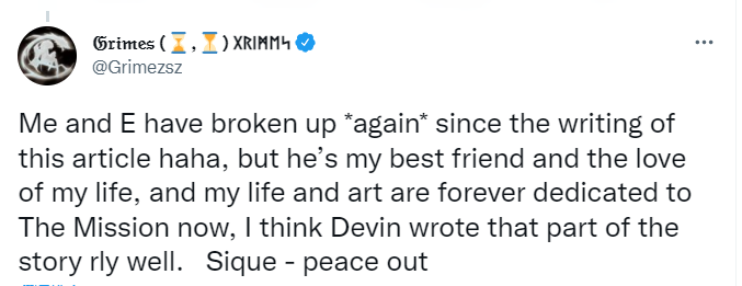 不过,在《名利场》的封面文章发出之后,Grimes再次发推,称自己和马斯克「又分手了」,但仍然称马斯克为最好的朋友和一生真爱。