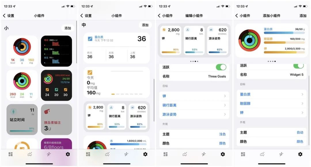 FitnessView 的小组件是我见过自定义程度最高的,除了小、中、大三种尺寸,我还可以选择每一个小组件的样式、目标、主题、颜色、摘要、打开方式等。最让我赞叹的是,除了应用默认的小组件,我还可以根据自己的需求从头创建一个全新的小组件,充分满足了我个性化的需求。