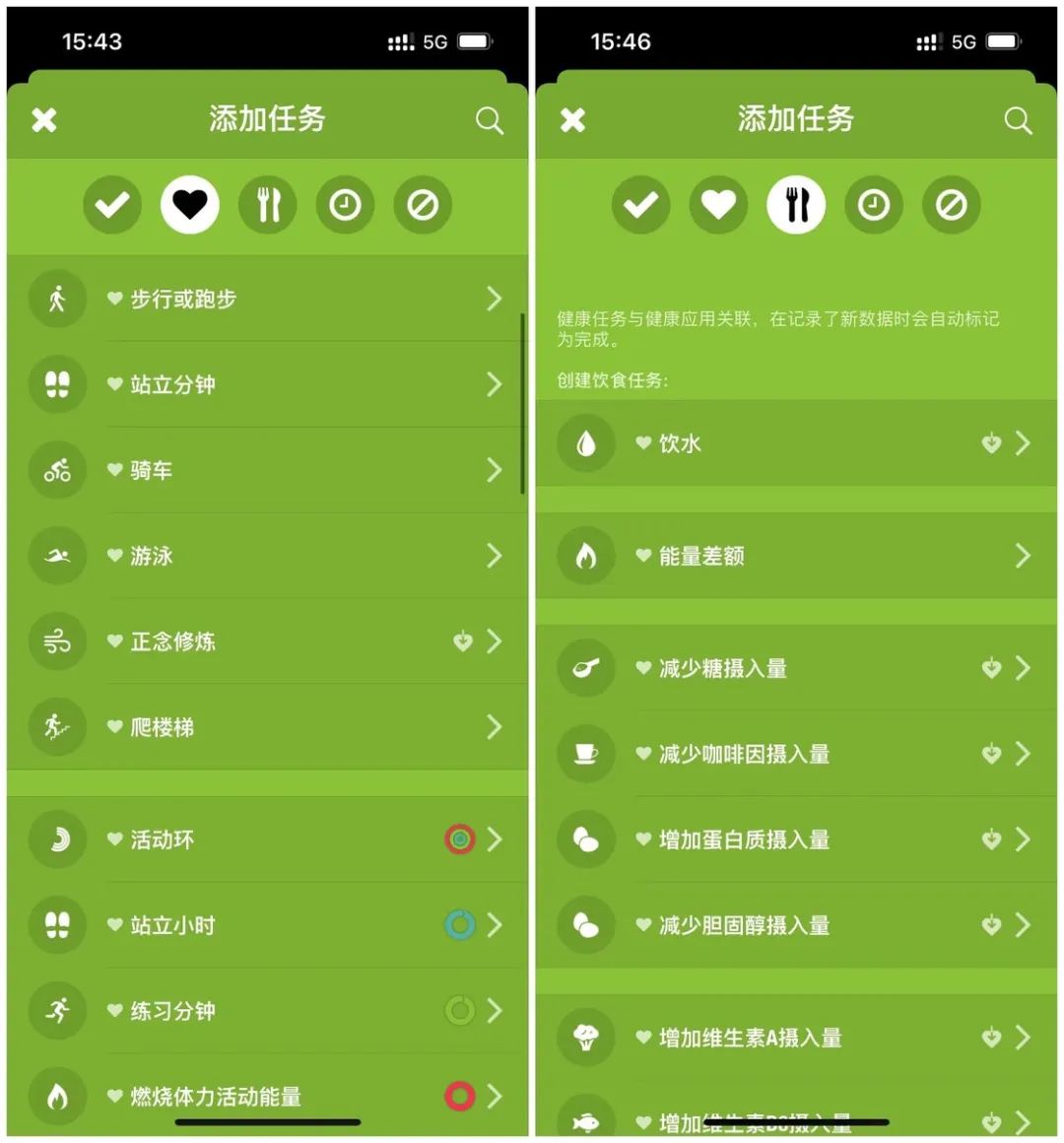 是一款非常特别的习惯养成 App,里面预设了很多项与健康中心相连的项目,包括我们常用的走路、跑步、记录体重、睡眠、就寝时间等健康数据和饮水量、糖摄入量、咖啡因摄入量等饮食数据,这些项目无需手动点击完成,仅需授权健康中心写入数据,在达到目标后它会自动识别完成。