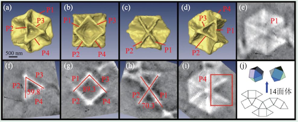 图3 凹陷Escher 型硫化铜十四面体微晶的三维结构定量分析(a—d)不同角度的三维渲染图;(e—i)断层图,其中(f—i)分别对应于(a—d);(j)其表面6 个正方形和8 个三角形的构造示意图(引自参考文献[22])