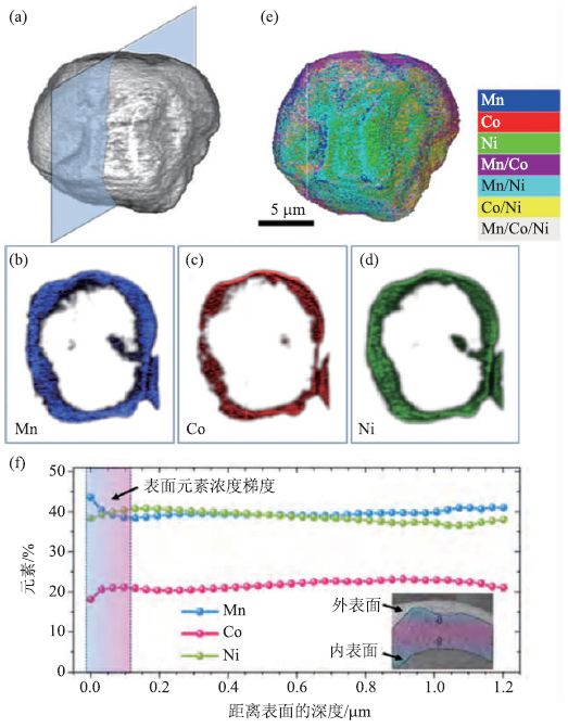 图6 LiNi0.4Mn0.4Co0.2O2球形颗粒纳米成像三维图及元素分布图(a)颗粒的三维结构渲染图;(b—d)颗粒中心断层上的元素分布;(e)颗粒的三维元素关联组分分布图;(f)颗粒内部的元素分布随着深度变化而变化(引自参考文献[21])