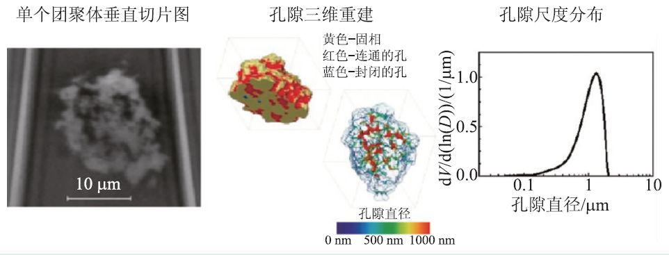 图4 聚集体的三维重构断层图、三维渲染图和孔隙大小分布(引自参考文献[23])