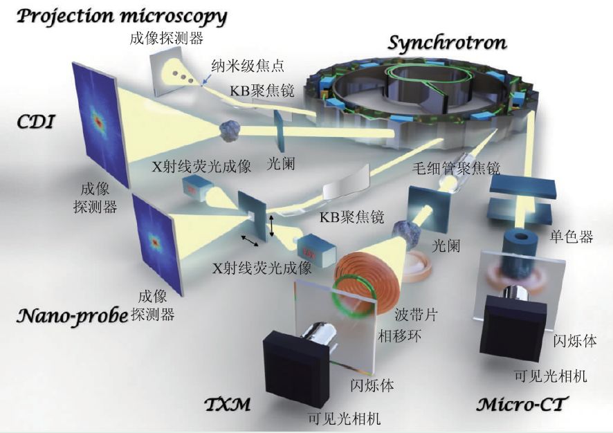 同步辐射纳米成像方法的主要技术方案包括纳米分辨全场成像(几何放大成像、“透镜”放大成像)、纳米分辨探针扫描成像和纳米分辨相干衍射成像。这些成像技术可以应用在不同的能量范围,又各具特色。图1给出了基于同步辐射装置的常用的X射线成像技术示意图,其中包含了同步辐射X射线显微CT成像(Micro-CT)、基于波带片的纳米分辨全场成像(transmission X-ray microscopy,TXM)、纳米分辨探针扫描成像(Nano-probe)、相干衍射成像(coherent diffraction imaging,CDI)和几何放大投影成像(Projection microscopy)。