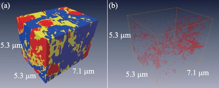 图5 Ni—YSZ阳极材料三维分割图(a)Ni—YSZ阳极的三维渲染图(黄色:孔隙;红色:Ni;蓝色:YSZ);(b)三相界面的空间分布(引自参考文献[24])