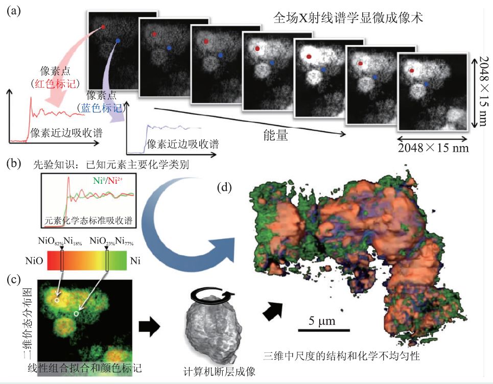 这里介绍的同步辐射纳米分辨谱学成像是指将同步辐射纳米分辨全场成像技术和X射线光谱学技术相结合,获取样品中元素及价态三维分布的实验技术。谱学成像是利用样品中不同化学成分对X射线能量扫描的不同响应来同时获取样品形貌和化学成分的信息。这种实验手段所获取的数据结构可以认为是一系列具有空间分辨的X射线吸收谱,也可以被当作是一系列能量分辨的X射线透射图像[10,20]。不论采用哪一种成像装置来开展谱学成像实验,最终的数据处理和分析都需要结合X射线成像和谱学的专业知识。图2 是一个具有代表性的X 射线谱学成像实例[21],利用在不同能量下采集的一系列图像上对应像素点的灰度值可以获得基于该像素的吸收谱曲线,从而实现成分及价态空间分布信息的获取。由于样品的化学成分分布不均匀,X射线图像的每一个像素所对应的吸收谱都有可能是不一样的(图2(a))。如果对样品中可能出现的化学组分已经有所预期,则可以通过与标准谱线(图2(b))的对比得到定量的组分百分比,从而得到以颜色代表组分或价态的彩色X射线图像(图2(c))。在这里,需要强调的是,图像中的颜色是通过吸收谱线分析得出的定量结果,是有明确的物理化学意义的。X 射线谱学成像可以和CT技术相结合,获得样品内部各种化学成分及价态在三维空间中的分布。图2(d)显91 152.615示,一颗电池材料颗粒在部分放电后,颗粒形貌发生剧烈变化的同时伴随着Ni 价态的降低。