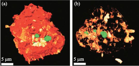 图7 同步辐射纳米成像技术揭示了铁基费托催化剂颗粒中,铁(红色)、锌(绿色)和钛(黄色)元素的三维分布(a);(b)为铁被隐藏后的透视图(引自参考文献[29])