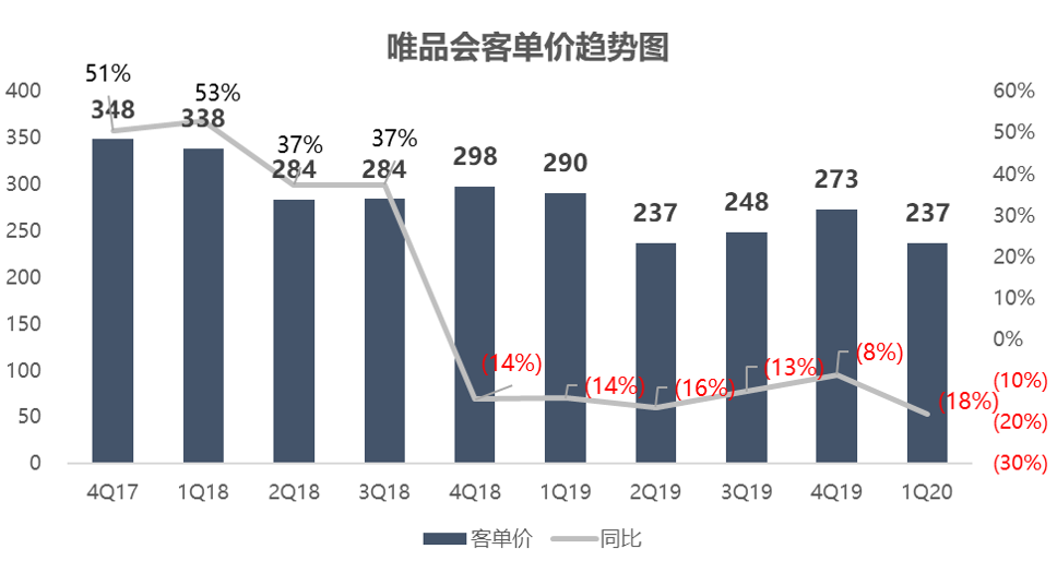 首先是客单价的降低。财报数据显示,2020年第一季度,唯品会客单价由上季度的273元下降至237元,环比下降13%,同比下降18%。。