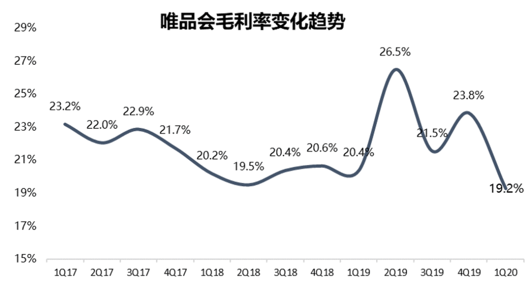 然而,与服饰相比,标准化商品的毛利率相对较低,拖累公司整体毛利率表现。2020年第一季度,唯品会毛利率有所下滑,同比下降1.2个百分点,环比下降4.6个百分点,至19.2%。