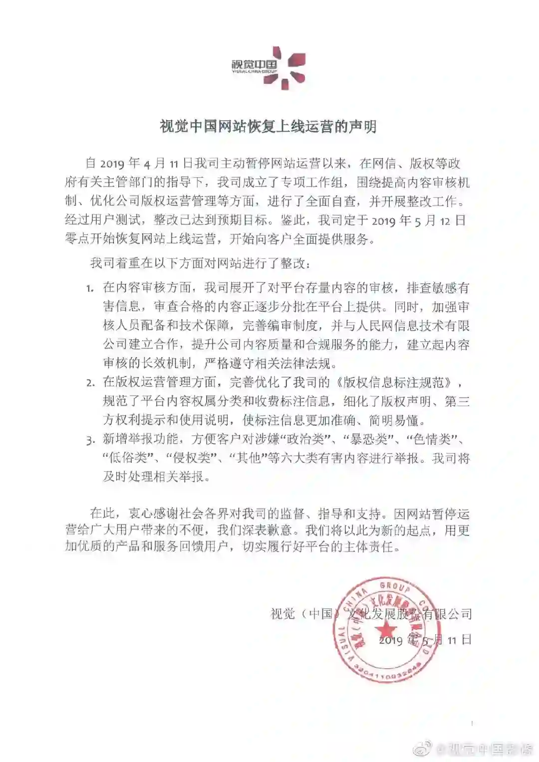 5 月 11 日,视觉中国发布声明,经过用户测试,整改已达到预期目标,将于 2019 年 5 月 12 日零点开始恢复网站上线运营,开始向客户全面提供服务。