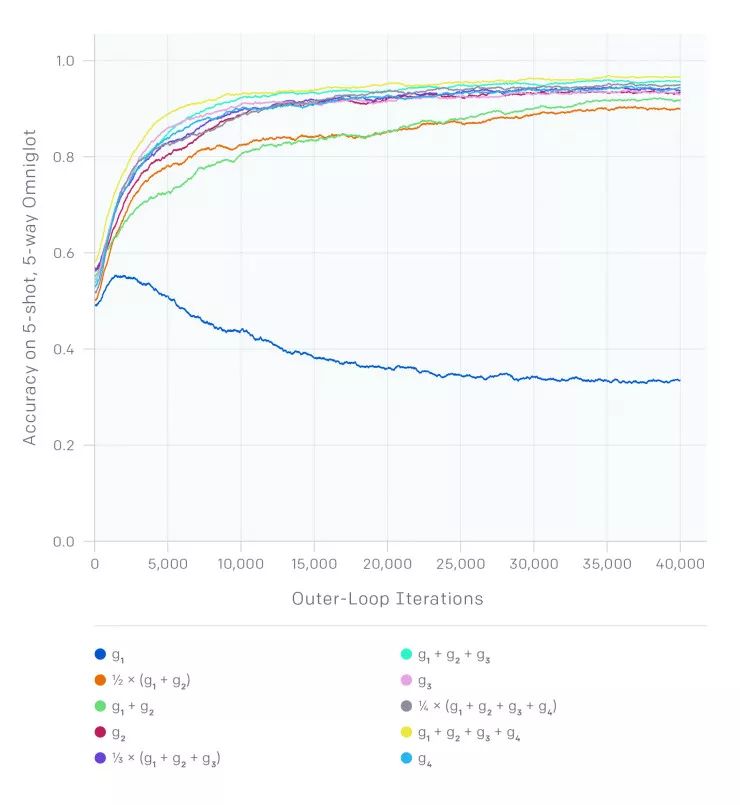 OpenAI 对 Reptile 的分析也表明,通过对随机梯度下降的梯度做不同的组合,我们可以得到许多中不同的算法。假设每个任务中使用不同的 minibatch 进行 k 步随机梯度下降,得到的梯度分别为 g1、g2、……、gk。下图就展示了在 Omniglot benchmark 中把每种不同的梯度和作为元学习的梯度的算法的学习曲线。g2 对应的是一阶 MAML,也就是最初的 MAML 论文中表述的算法。包括的梯度越多,算法学习得就越快,因为其中的方差会随之减小。可以注意到仅仅使用 g1(也就是 k =1 时)并不会给这个任务带来什么改进,因为零样本学习无法被改进。