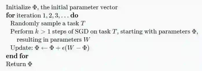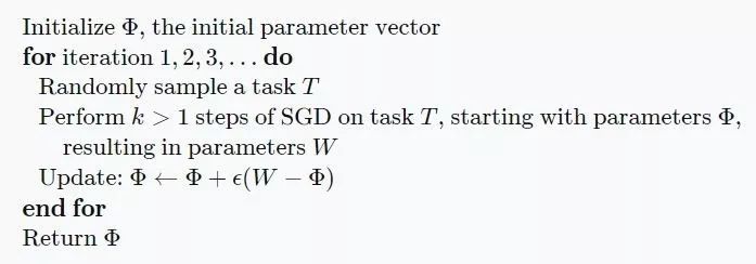 和 MAML 类似,Reptile 首先会为神经网络寻找一组初始参数,以便网络稍后可以根据来自新任务的数量不多的几个样本进行精细调节(fine-tune)。不过,相比于 MAML 需要在梯度下降算法的计算图中展开并求导,Reptile 只需要简单地在每个任务中以标准方法执行随机梯度下降(SGD),并不需要展开一个计算图以及计算任何二阶导数。这样的设计让 Reptile 所需的计算资源和存储资源都比 MAML 更小。Reptile 的伪码如下所示:
