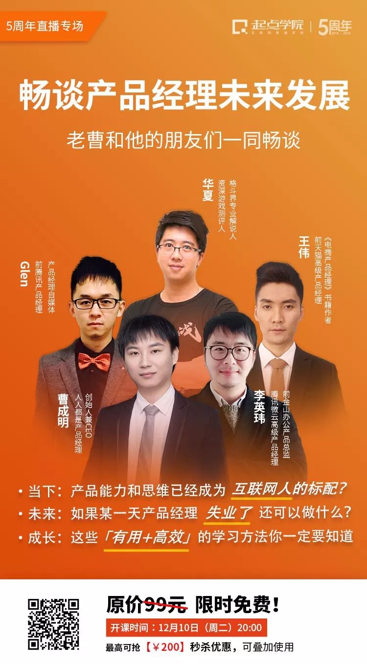 周二晚 20:00 起点学院5岁生日特别场丨《畅谈产品经理未来发展》,扫码即可预约!