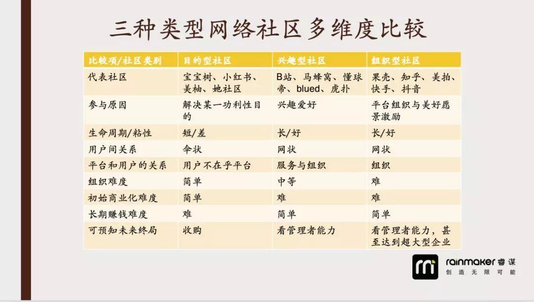 社区:平等的交流关系是社区的标志,因为平等才有交互,通过内容生产形成多对多的网状结构,强交互属性,用户有归属感和粘性,有文化自信,用制度制约社区发展。