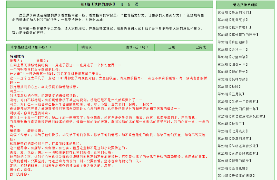 对比如今的网络舆论环境,当时晋江的氛围友好到“不可思议”。而这种“乌托邦”式氛围的集中体现,是2003年的“原创看文指南”榜单(当时多称为“官推榜”)。这个榜单由网文爱好者自发组织,进行全晋江扫文,不定期出推荐名单,选出了不少佳作。