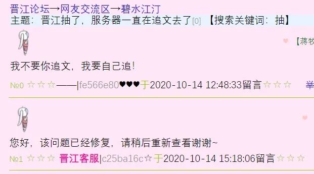 在晋江论坛原创区“碧水江汀”这个作者们出没的版块,“抽了”是个高频词。有时是APP卡顿,有时是评论区没法评论……各种问题,层出不穷。但用户们似乎已经接受了这个现实,坦然接受bug的存在。