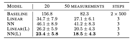 表2:使用不同测量函数的MNIST测试数据的重建损失。除了第一行之外,所有行都来自我们的模型。“±”表示测试样本间的标准差。(L)表示习得的测量函数,越低越好。