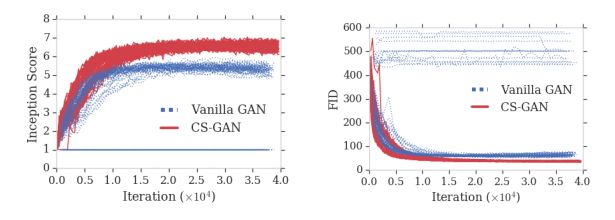 图4:在CIFAR训练期间的Inception Score(越高越好)和FID分数(越低越好)。