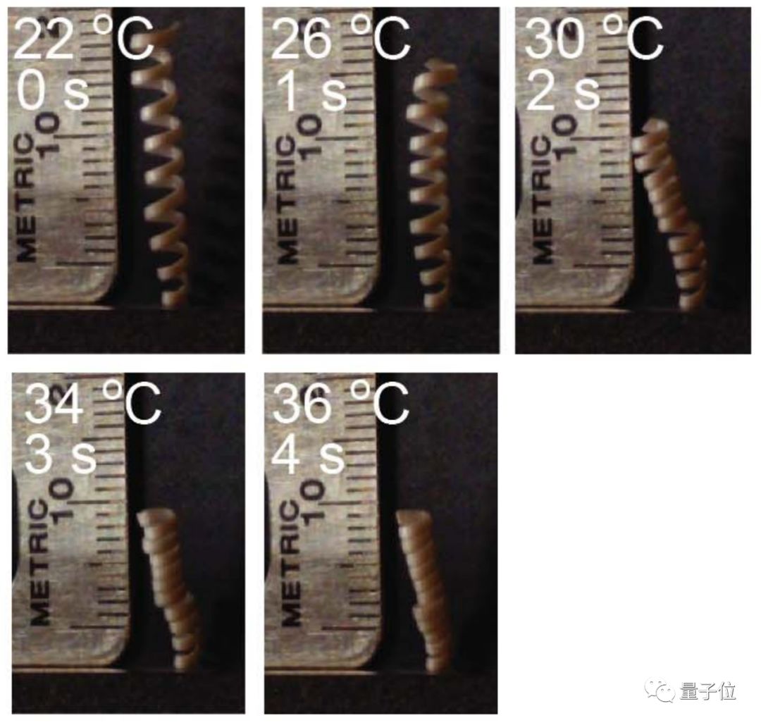 4秒钟的时间内,从22℃加热到36摄氏度,原本只有2厘米左右的“电话线”,迅速缩短到只有原来的一半左右。