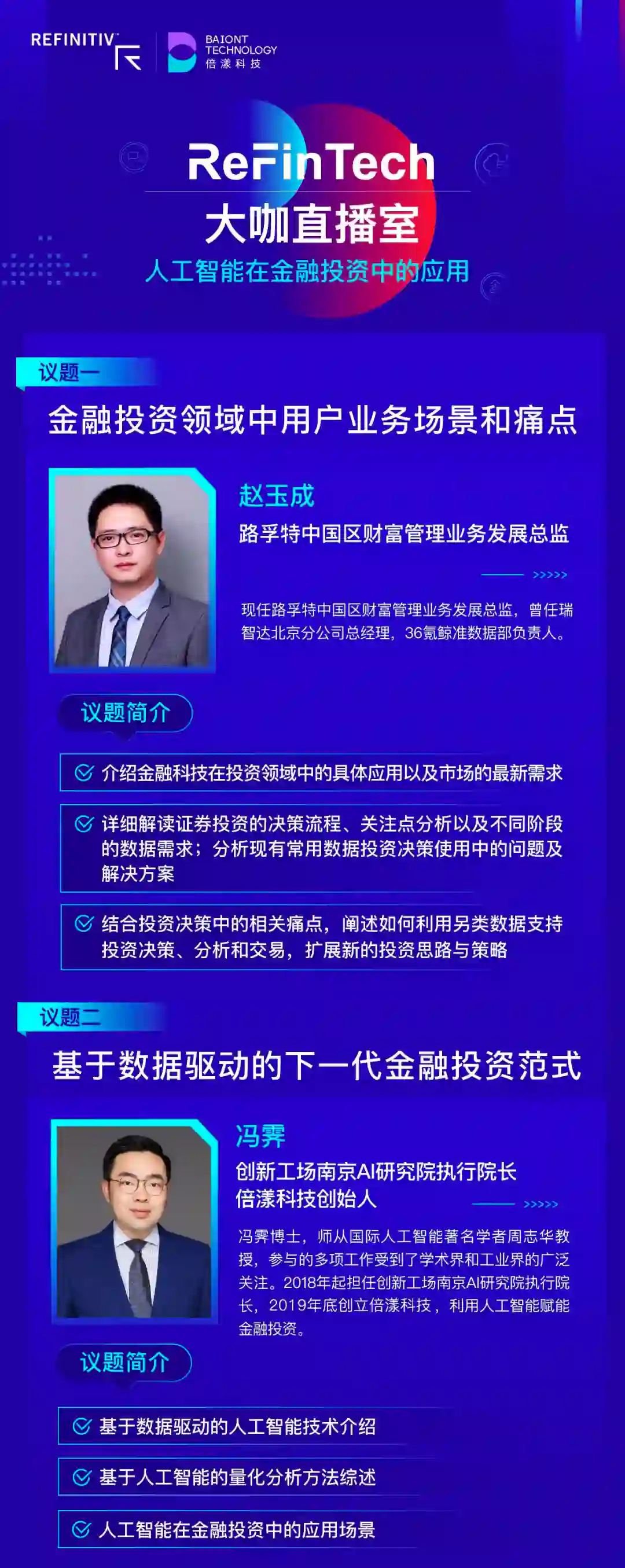 那么,金融科技在投资领域有哪些应用场景?用户在实际应用时又会有哪些痛点?如何利用金融数据建立量化交易平台?6 月 24 日,路孚特中国区财富管理业务发展总监赵玉成、创新工场南京 AI 研究院执行院长 & 倍漾科技创始人冯霁,将就上述问题,带给您一场精彩的线上分享。
