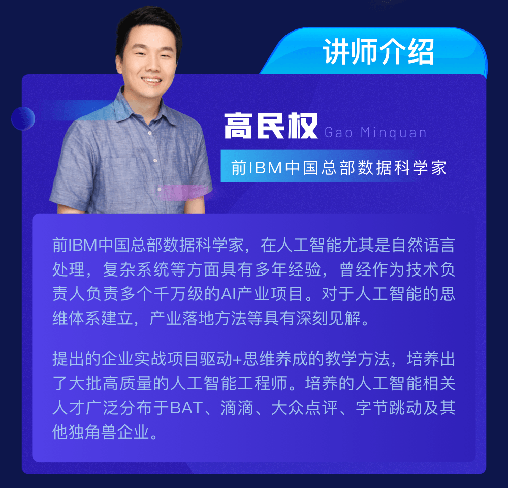 这次训练营的讲师是高民权老师,他从2018年至今,培养过诸多AI算法工程师,如果只算BAT、滴滴、字节跳动、微博、美团点评这些全国一线的企业,他的学生有超过50名就职在这些公司的算法岗位。入职后几乎很少有人跳槽或者被优化的,不少人现在也做到了技术leader这个级别。