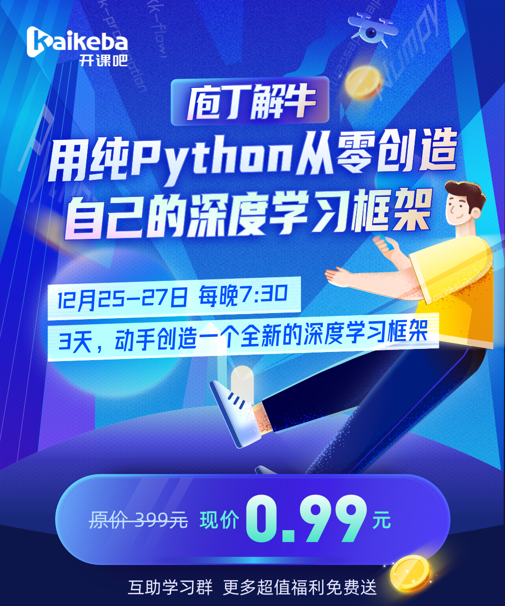 通过3天的《用纯Python从零创造自己的深度学习框架》,你可以一次性掌握深度学习框架搭建的原理,进一步探索激动人心的人工智能。