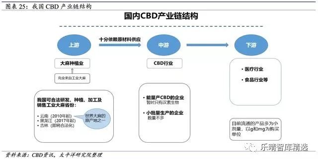 目前我国80%的大麻用于医药行业,CBD产能限制比较严格,CBD原材料为工业大麻,因此行业受到政府管制,只有政府下发牌照的企业才能合法生产大麻二酚。