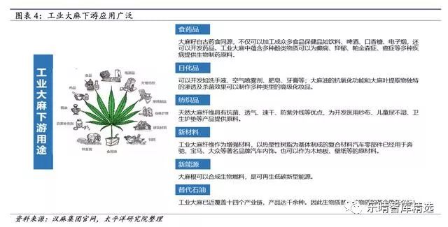工业大麻下游用途广泛,可用于药品、食品、化妆品、纺织等多个行业。