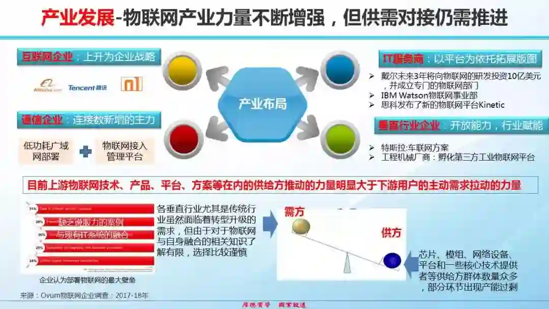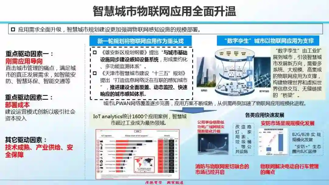 2018年12月12日,中国信通院发布了《物联网白皮书(2018年)》。本白皮书把握全球物联网最新发展态势,研判物联网传感器、芯片模组、网络、平台关键环节的技术产业进展情况,梳理消费物联网、智慧城市物联网、生产性物联网三类物联网应用现状及驱动因素,在对我国物联网现阶段情况归纳总结的基础上,提出我国物联网“建平台”与“用平台”双轮驱动、“补短板”和“建生态”相互促进、“促应用”和“定标准”共同推进、“保安全”与“促发展”相互促进的发展策略建议。