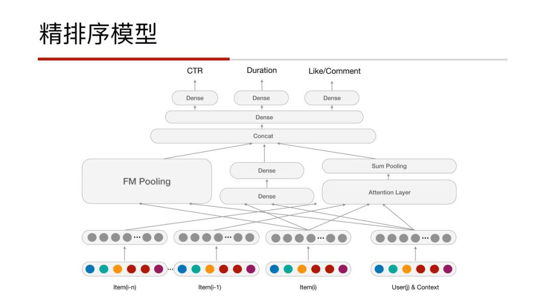 从底往上介绍模型,模型的右下角是用户的信息、交互信息与内容的信息,左下的部分是用户历史的行为集合;再往上一层是数据的Embedding层,稠密的向量;第三层的左面是FM模型的Pooling,FM以前在CTR中也用过,相比GBDT和LR传统的模型在排序结果中表现是非常好的,适合资讯信息流的Ranking,在这里主要捕捉的是低阶的交叉特征;中间的DNN模型捕捉的是更高阶的变化;右面是Attention的部分,NLP中的一个概念,在这里用来捕捉Session 序列,包括用户的行为序列,所以自然想到用Attention去建模。大致看起来,模型的左半边部分像DeepFM,而右边像阿里的DIN。再往上一层,将子网络的各个部分做一个concat,然后几层Dense,做一个多目标的学习,目标不止有CTR、Duration时长,还有会有Like/Comment 点赞、评论的目标等。最后可以根据业务需求去调整指标的权重,有针对性的去优化,当然这部分我们也计划尝试用强化学习来学习这些超参数。
