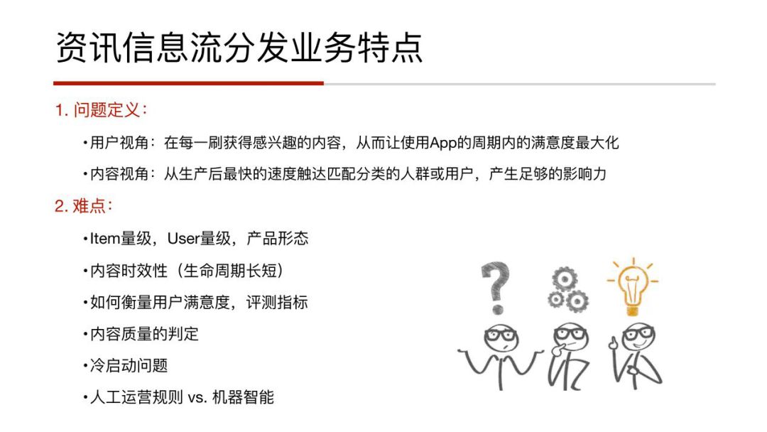 人工运营规则VS机器算法:在资讯信息流推荐系统承担的可能不止是一个长尾兴趣的分发,还会有一些运营行为和人为规则的引入。所以两者的效果如何调和、平衡甚至是互补,也是一个难题。其中,我们要明确算法的边界是什么,哪些能做,哪些达不到,比如让机器去做文本分类,业界已经有很成熟的解决方案了,但是让机器去判别文风或者文采,就会很难。首先如何定义这些就是主观的标准,对人来说,尚且不容易,让机器去评判一个非常主观的标准,本身就是很难的。