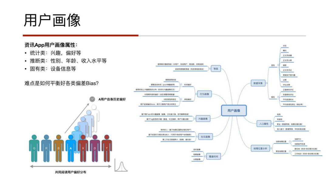 因为之前大家对于用户画像的比较关心,所以这里单独增加了一个slide。简单介绍下,用户画像的特征工程其实是比较简单的,主要是数据的处理环节,在画像的设计上可能会有些考量。资讯类的用户画像主要分为三类:统计类、推断类、固有类。右面的思维导图是大概的用户画像的归类,主要是: